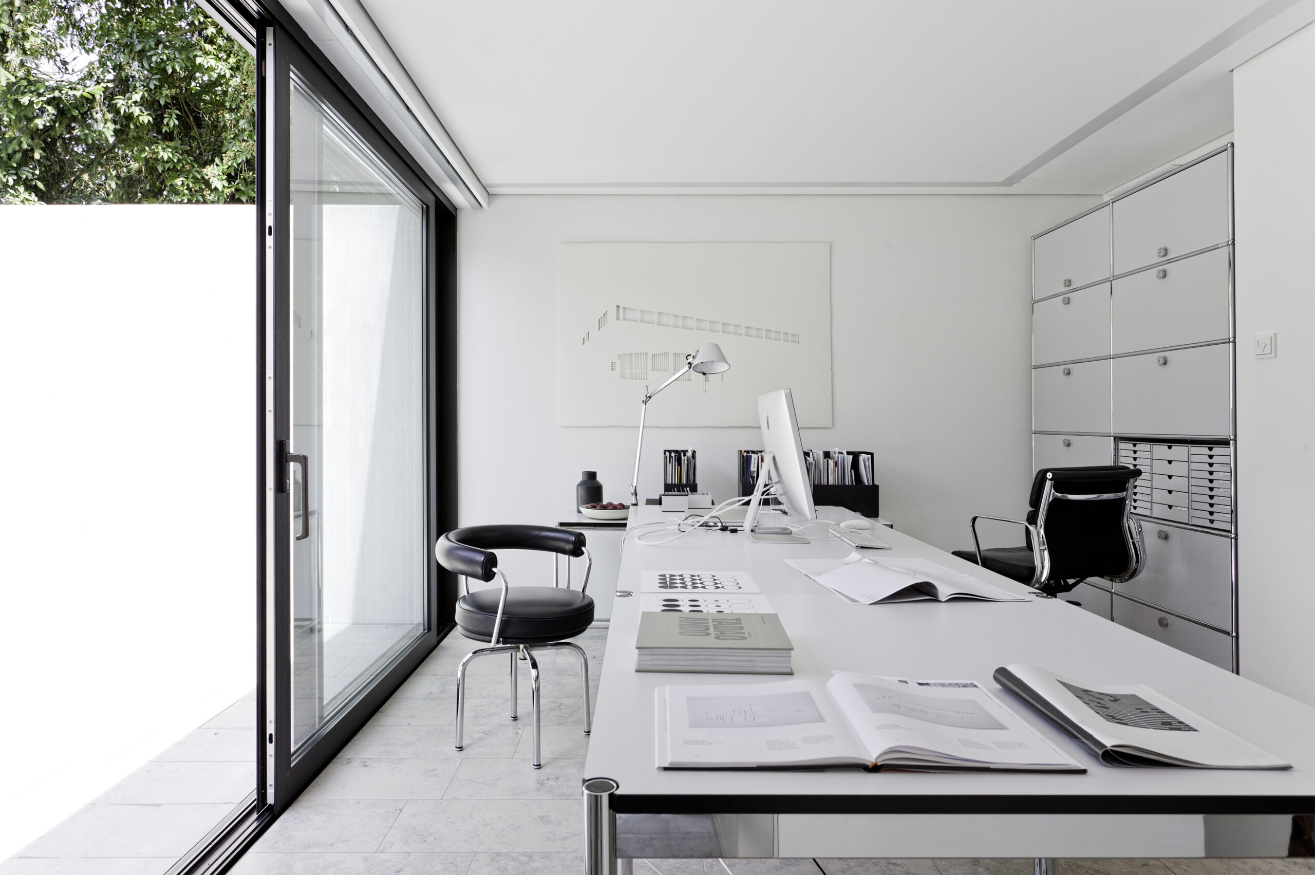 USM ist DIE Marke, wenn es um Büroeinrichtung geht – und auch im Home-Office erweist sie sich als unschlagbar: Aus einem bestehenden Fernsehregal von USM kann einfach ein Arbeitsplatz gestaltet werden der für Ordner, Bücher oder Unterlagen als Aufbewahrung dient. Die USM-Möbel halten nicht nur ewig, sie lassen sich auch sehr einfach ergänzen und passen sich damit jeder (Wohn- und Arbeits-)Situation an.