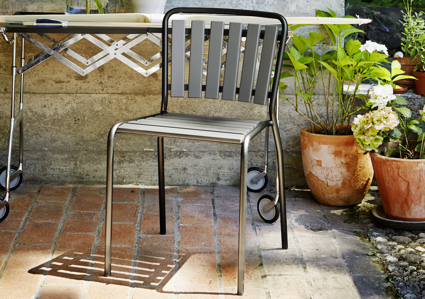 Es gibt ihn in fünf Farben oder in Esche natur mit wahlweise feuerverzinktem oder pulverbeschichtetem, dunklem Gestell. Sowohl mit als auch ohne Armlehnen lädt der stapelbare und wetterfeste Klassiker zum Niederlassen ein.