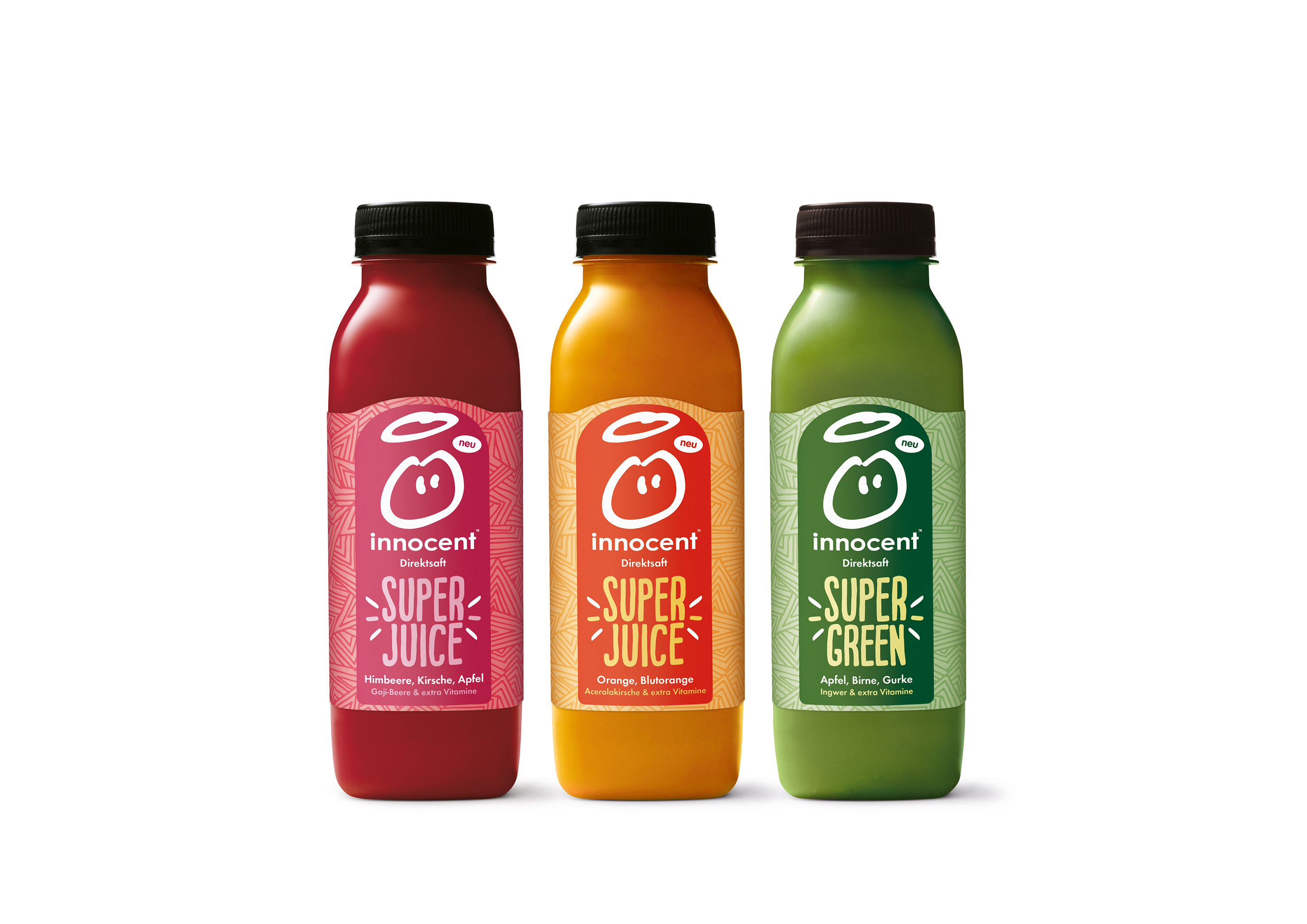 Für alle, denen Obst nicht reicht, gibt es jetzt eine super Neuigkeit: innocent Super Juices. Die neuen Functional Juices werden, wie alle innocent Smoothies und Säfte, aus bestem Obst und Gemüse gemixt. Das Besondere an dieser völlig neuen Produktkategorie: Die Drinks werden mit Super-Extras wie Ingwer, Acerolakirsche oder Goji-Beeren und zusätzlichen Vitaminen angereichert. Sie wurden gemeinsam mit Ernährungswissenschaftlern entwickelt und helfen dabei, sich im Alltag mit dem zu versorgen, was man für einen aktiven und ausgewogenen Lebensstil braucht.