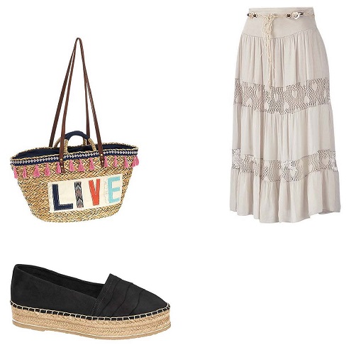 Florale Muster, lange wallende Roben und verspielte Details die feminin, romantisch und locker getragen werden. Der Maxi-Rock von Black-Box mit Stickdetails kombiniert mit den bequemen Espadrilles mit Plateauabsatz verkörpern den Stil perfekt. Für den letzten Feinschliff ergänzt man den Look mit Armbändern und Ketten und der geflochtenen Basttasche von Catwalk mit verspielten Tasseln und aufgenähtem Patch.
