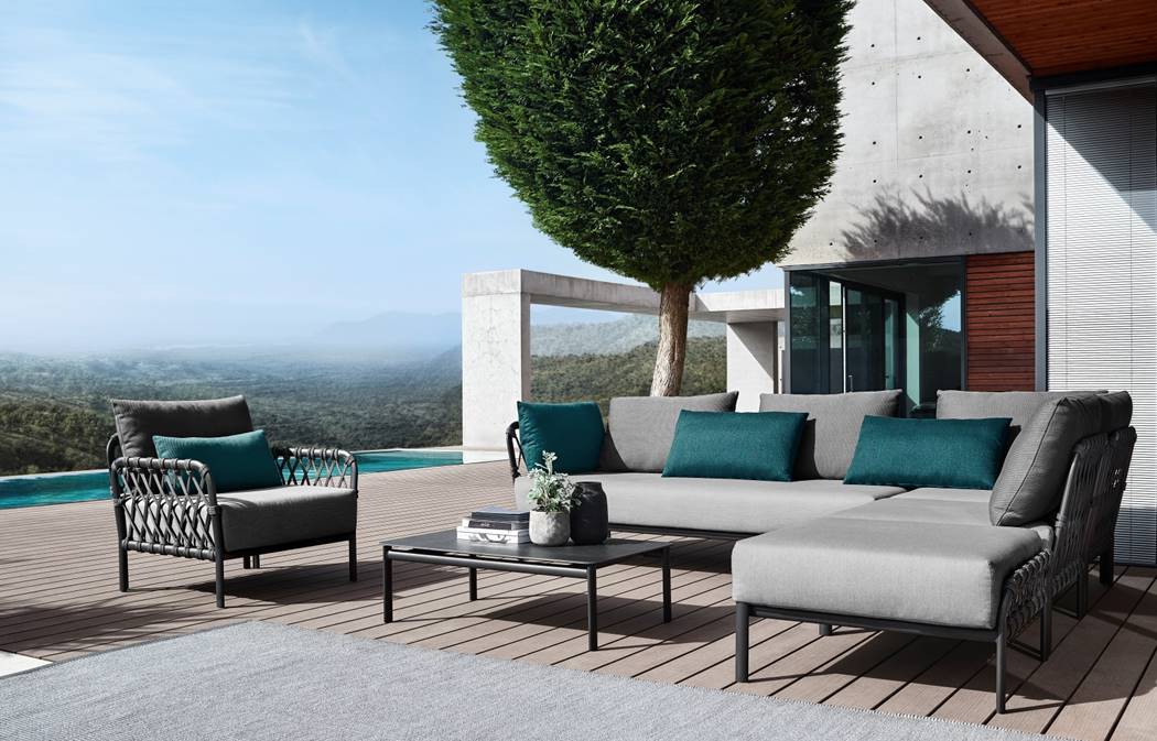 Entworfen wurde die von einer gerundeten Silhouette und einem filigranen Rautengeflecht geprägte modulare Lounge CARO von dem renommierten deutschen Designbüro Hoffmann Kahleyss Design, das Möbel für namhafte internationale Marken kreiert. Die in Anthrazit beschichteten Aluminiumrahmen von CARO sind aufwendig mit String Flex Outdoor-Seil in Anthrazit umwoben und geben so dieser modularen Sitzgruppe eine zeitlos elegante Note, die sich in jedem Outdoor-Bereich wie zu Hause fühlt. Perfekt ergänzt wird sie mit üppigen, tiefen Sitzkissen und lässigen Wurfkissen für puren Outdoor-Luxus.