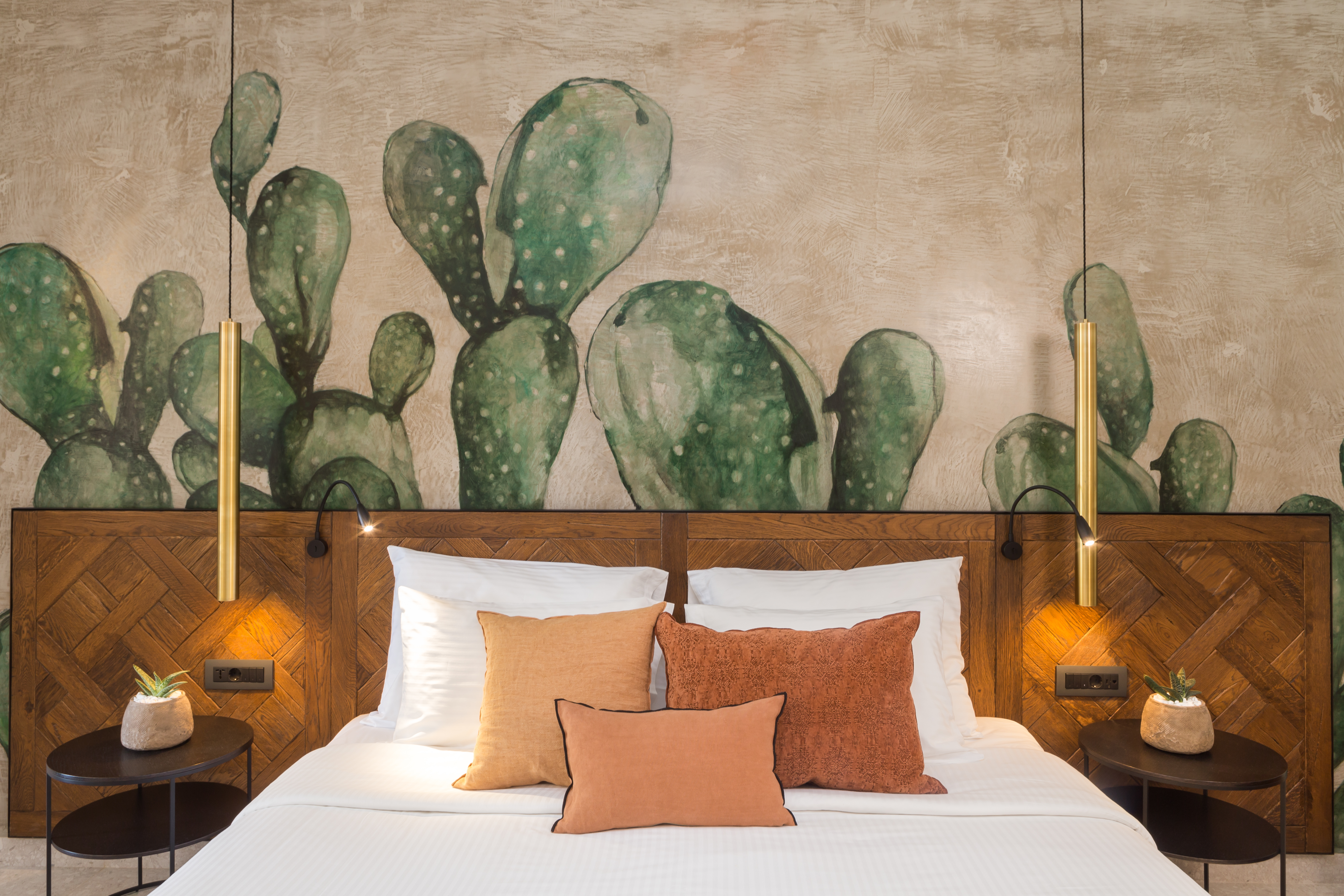 Kreta, Kunst, Kultur und Kaktus: Das zentrale Element des neuen Designs im Cretan Malia Park ist der landestypische Feigenkaktus. Er ziert als künstlerisches Pendant zum naturnahen Style des Resorts als riesiges Gemälde in den meisten Zimmern die Wandfläche hinter den großzügigen Betten und schafft so eine sanfte Verbindung zur üppigen Vegetation vor der Tür. Die maximal zweistöckigen Bungalows liegen nämlich eingebettet zwischen wildgewachsenen Olivenbäumen, bunten Pflanzenbeeten mit einheimischen Kakteen und weitläufigen Rasenflächen – während im Hintergrund das azurblaue Wasser der griechischen Ägäis schimmert.
