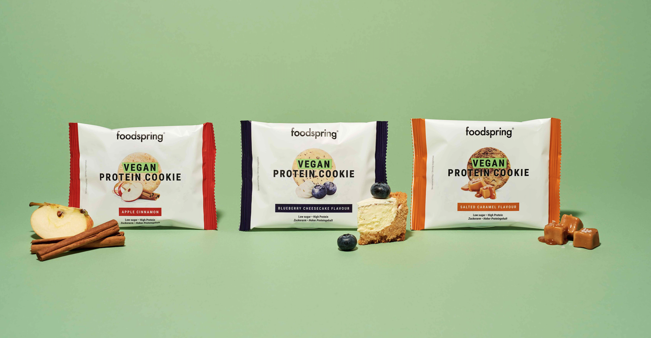Der Geschmacksklassiker Apfel-Zimt hat das ganze Jahr Hochkonjunktur und verführt mit fruchtig-wür- ziger Note. Saftige Blaubeeren treffen keksigen Cheesecake. Bei der Sorte Blueberry Cheesecake läuft das Wasser im Mund zusammen! Richtig schön karamellig mit einer extra Prise Salz. Der Vegan Protein Cookie Salted Caramel ist süss und salzig. Ideal, wenn Du nach einem Snack suchst und Dich nicht zwi- schen zwei Geschmäckern entscheiden kannst.