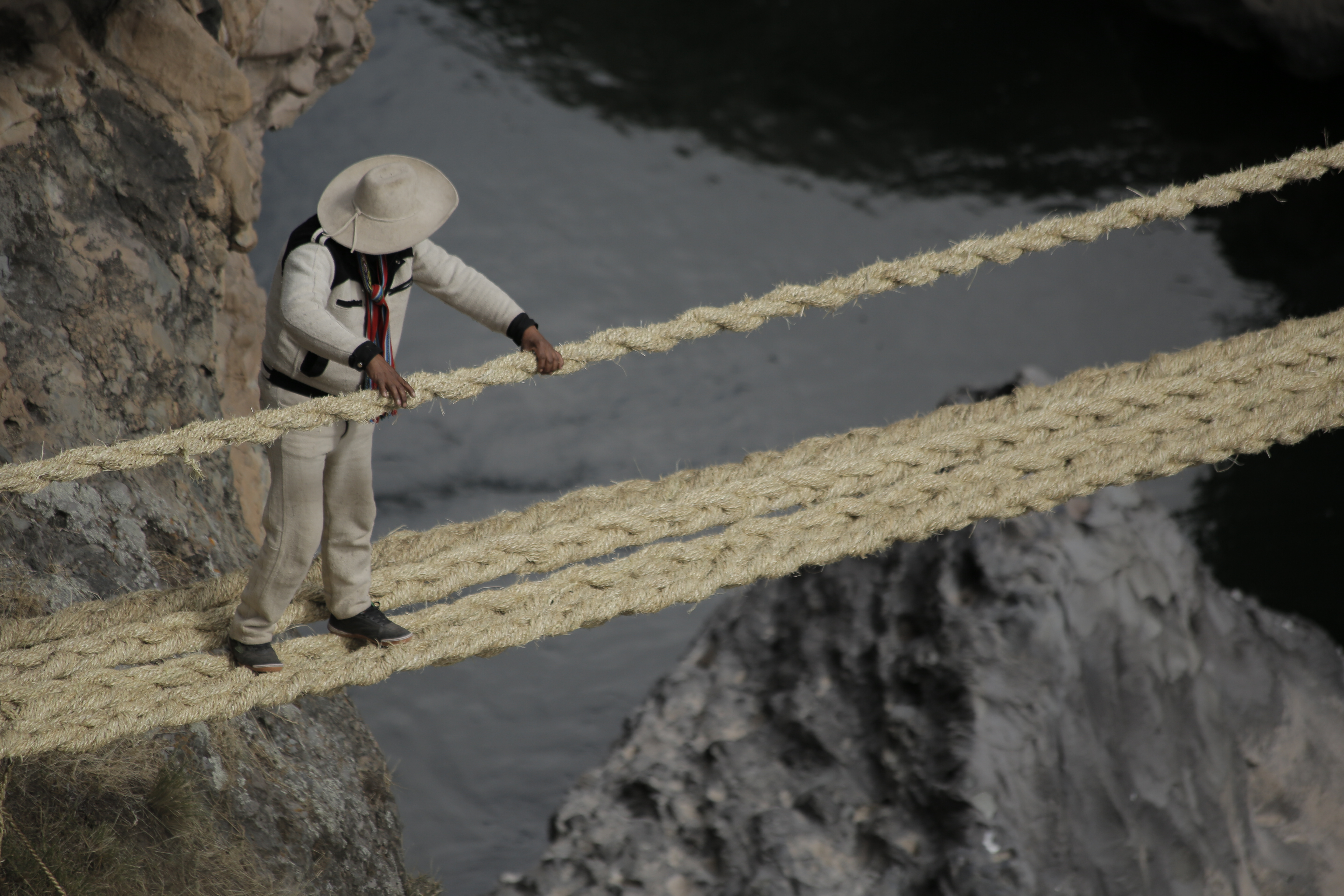 Die 28 Meter lange Hängebrücke Q’eswachaka besteht vollständig aus geflochtenem Gras und überspannt schon seit 500 Jahren in knapp 15 Metern Höhe den Fluss Apurímac und ermöglicht es so schon seit den Zeiten der Inka, den Fluss gefahrlos zu überqueren. Wie viele andere Inka-Brücken wurde auch Q’eswachaka zerstört, um Pizarro aufseinem Marsch nach Cusco aufzuhalten. Später wurde die Brücke wieder aufgebaut, seitdem kommen jedes Jahr im Juni um die 700 Menschen aus den vier umliegenden Dörfern Huinchiri, Chaupibanda, Choccayhua und Ccollana Quehue für drei Tage zusammen, um die Brücke neu zu errichten, denn die Grasfasern überdauern nur eine Saison. Für die Quechua dient diese Tätigkeit nicht nur der Instandhaltung der Brücke, sondern vor allem dem Erhalt des Miteinanders. Die Brücke symbolisiert die Einheit der Gemeinden mit der Natur sowie ihrer Geschichte und Traditionen. Bei einem großen Fest wird die neue Brücke anschließend feierlich eingeweiht.