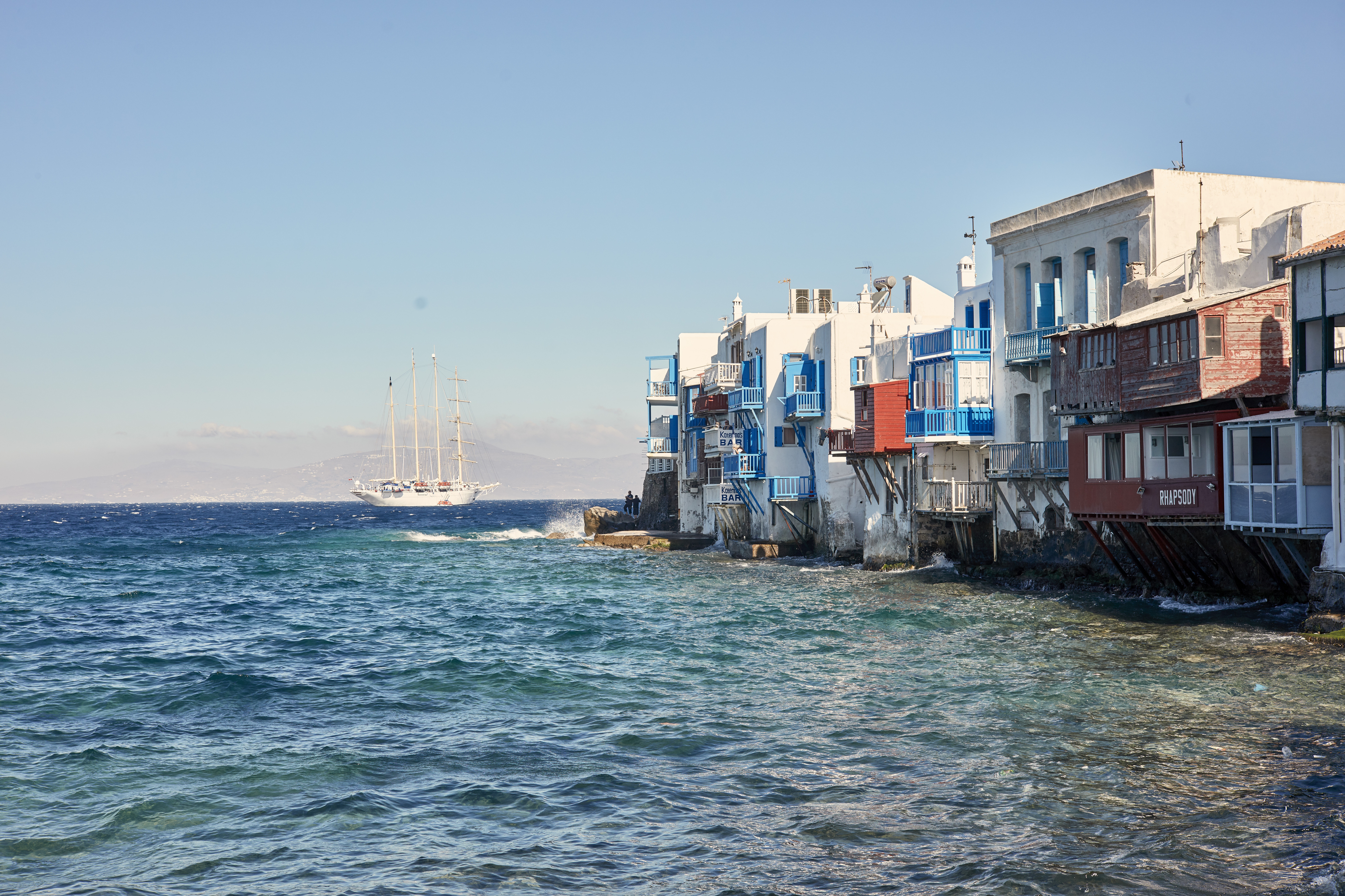Little Venice – Im Herzen von Mykonos Stadt, direkt am Strand der Ägäis, liegt Little Venice. Geprägt von bunten Häuserfassaden, ist Little Venice die Ausnahme von dem bekannten weißblauen Häuser-Meer, denn hier sind auch rote und grüne Farben zu finden. Insbesondere abends ist dieser Stadtteil ein Highlight, wenn er beim Sonnenuntergang in all seinen Farben erstrahlt. Diese Zeit eignet sich besonders für Schnappschüsse und wer daraufhin traditionelle griechische Spezialitäten kosten möchte, hat es nicht weit zur Strandpromenade. Dort befinden sich viele kleine Tavernen, die ideal sind für ein Abendessen am Wasser.