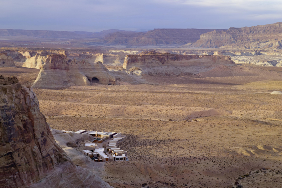Amangiri mit seinen 34 Suiten liegt in einem geschützten Tal an der Grenze zu Arizona und bietet einen Rückzugsort in der stillen Magie der Wüste. Während das Resort mit seinen klaren Linien, den erdfarbenen Tönen und Materialien wie Leder, Sandstein und Holz bewusst natürlich-modern gehalten ist, bietet der spektakuläre Swimmingpool des Resorts durchaus ein Urzeit-Erlebnis: Die ihn umsäumende Felsklippe besteht aus 165 Millionen Jahre altem Gestein.