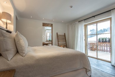 Gemeinsam mit den renommierten Designern von Weber Interior Design & Decoration aus Zell am See hat Inhaberin Jacky Hasenauer das Chalet mit viel Gespür und Liebe zum Detail eingerichtet. Im Masterbedroom, zwei weiteren Schlafzimmern und zwei zusätzlichen Schlafkojen unterm Holzdach auf der Galerie des Chalets können bis zu zehn Personen die nächtliche Stille des Bergs und morgendliche Weitblicke auf das Panorama der Alpen genießen. Ob von einer der privaten Terrassen und Balkone oder mithilfe des chaleteigenen Teleskops – das Sternenzelt über der Schmiedalm ist zu jeder Jahreszeit mehr als einen Blick wert.