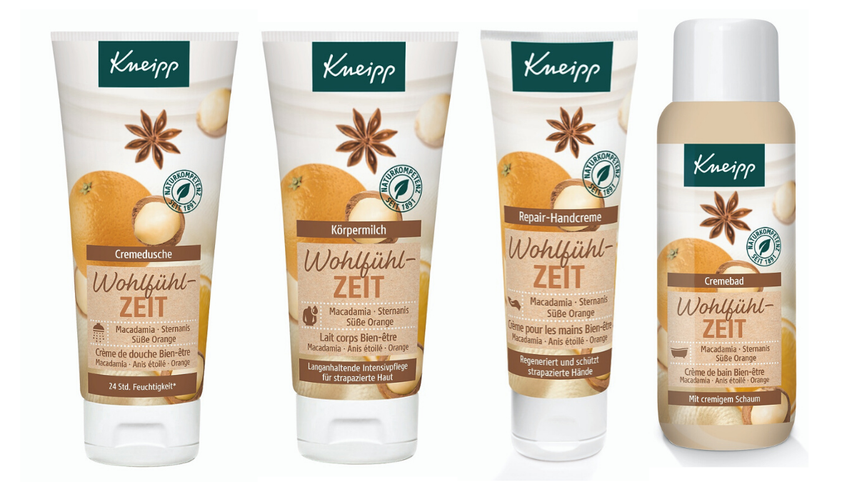 Hochwertiger Macadamiamilchextrakt trifft auf würziges Sternanis und einen Hauch süsser Orange – diese Komponenten lassen die Produkte der neuen Linie «Wohlfühlzeit» von Kneipp wunderbar wohltuend riechen. Ob ein sanftes Cremebad, eine verwöhnende Cremedusche oder die pflegende Körpermilch – sie alle verwandeln das Badezimmer in eine Wohlfühloase. Dank der Handcreme kann man auch unterwegs eine Wohlfühlzeit erleben.