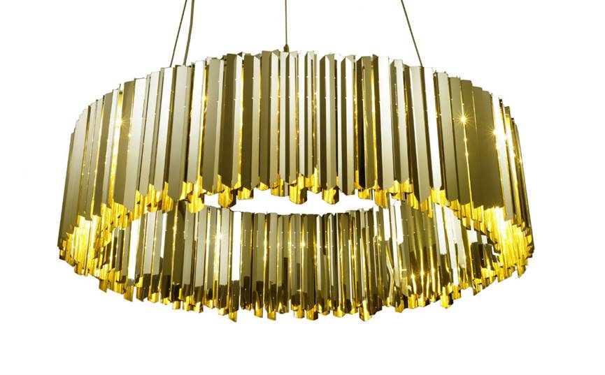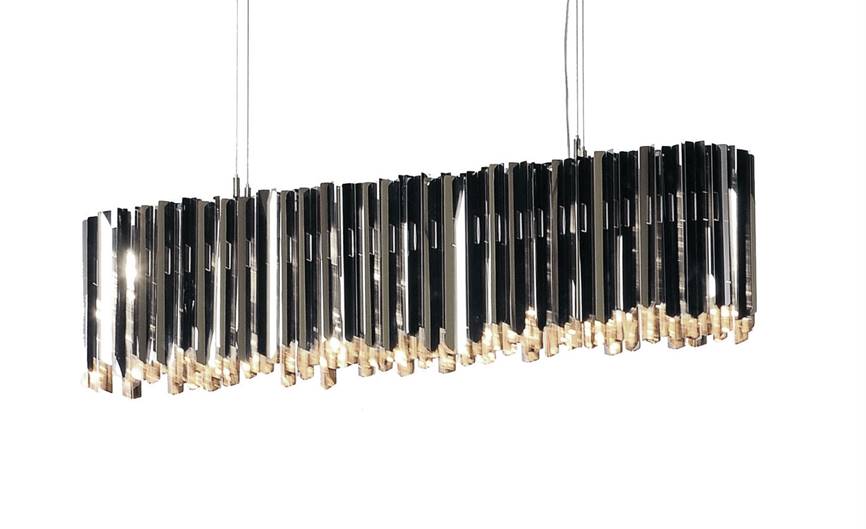 Hunderte von gefalteten und polierten Edelstahlstreifen reihen sich um den Lampenumfang und kreieren so eine Oberfläche von zahlreichen kleinen Facetten, die alle ein erstaunlich fragmentiertes Bild ihrer Umgebung einfangen und widergeben. Dieser glitzernde Effekt trügt zunächst das Auge und lässt denken, dass der Leuchter aus Glas oder Kristall besteht. Bei näherer Betrachtung, erkennt man dann, dass die einzelnen Facetten aus perfekt poliertem Metall bestehen.