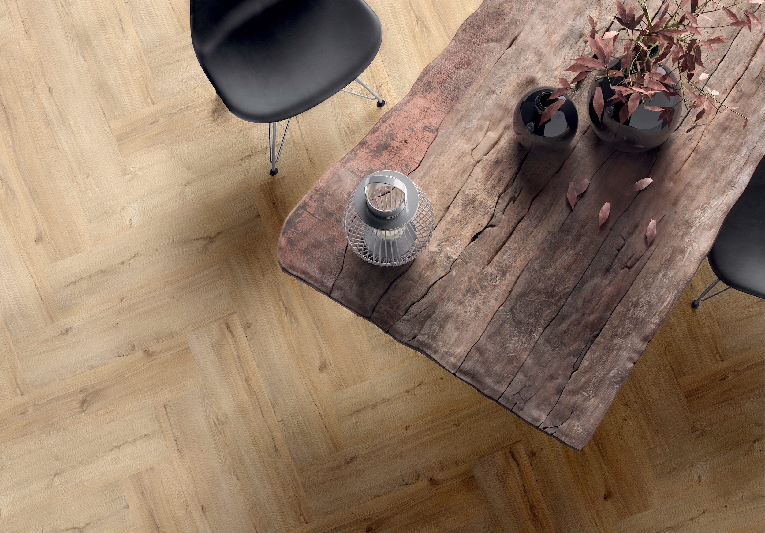 Mit der neuen Verlegeart Fischgrat Naturo Vinyl werden zwei wesentliche Anforderungen an einen Bodenbelag bestens miteinander vereint: hohe Widerstandsfähigkeit und auserlesene Ästhetik. So wird der Boden zu einem echten Hingucker und verleiht dem Raum einen raffinierten und eleganten Charme.