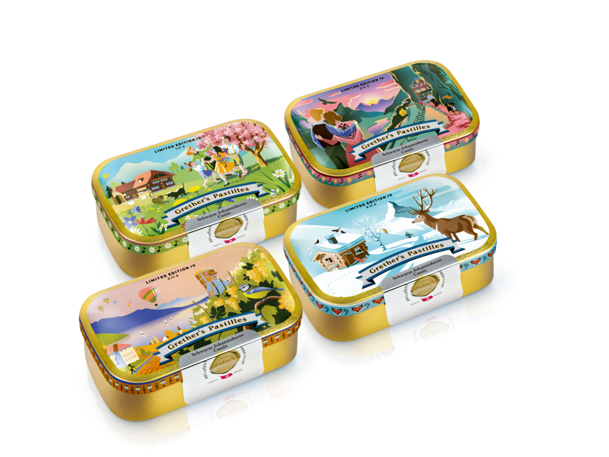 Grether’s Pastilles sind Kult. Und Kult sind auch die goldenen Dosen mit Schweizer Retro-Motiven. 2022 erscheint die limitierte Sonderedition bereits zum vierten Mal. Illustriert hat sie die Basler Künstlerin Patrizia Stalder. Bereits im Vorfeld werden die Designsujets der Limited Edition von Apotheken, Drogerien und Fans vorreserviert.
