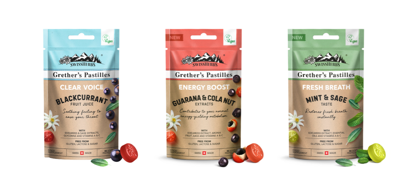 Erstmals in der traditionsreichen Geschichte der Grether’s Pastilles kommt eine vegane Neuheit in drei Sorten auf den Markt. Die SwissHerbs® Grether’s Pastilles, ein Nahrungsergänzungsmittel mit Vitaminen, Glycerin und Edelweiss-Extrakt. Die Pastillen sind nicht nur vegan, sondern auch Zucker-, Laktose- und Glutenfrei. Sie enthalten Edelweiss-Extrakte aus dem Wallis.