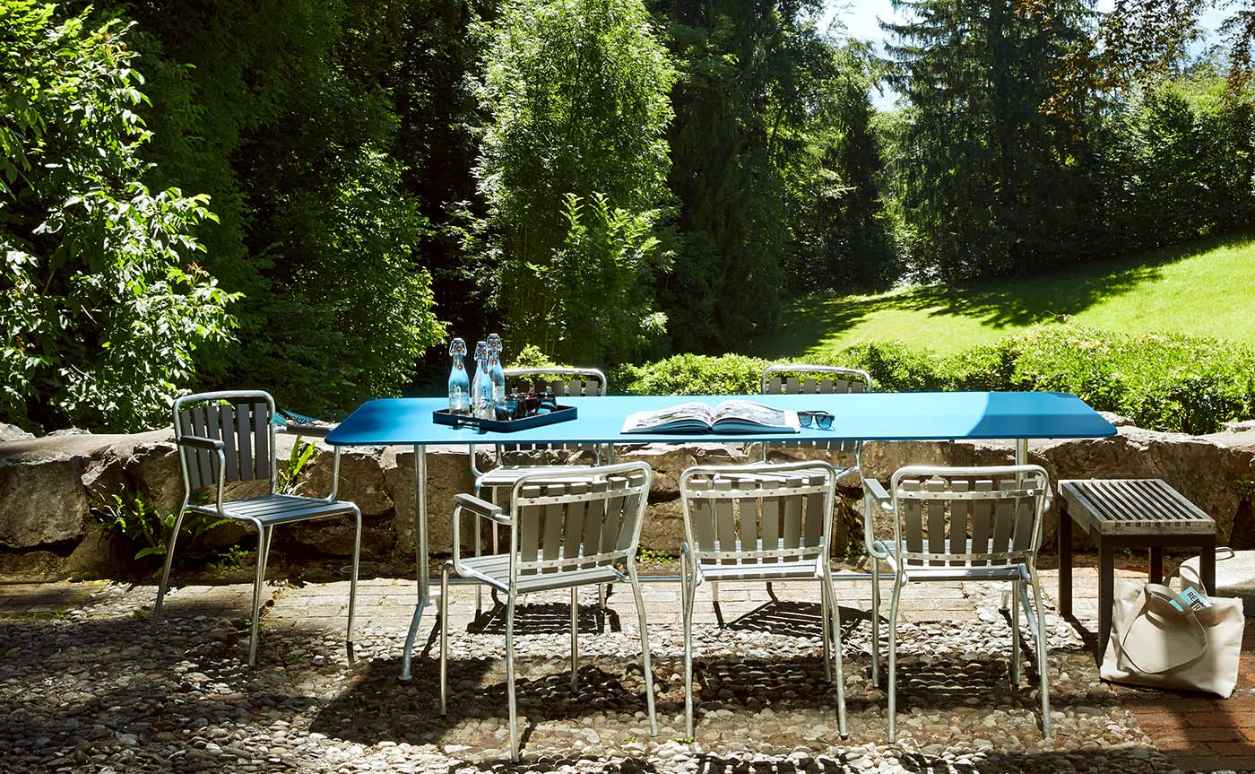 Der Haefeli Stahlblechtisch, ein beliebter Designklassiker von Embru, macht im Garten wie auch auf der Terrasse eine gute Figur. In den frischen, sommerlichen Farben eignen sich die klappbaren Gartentische besonders als Ergänzung zum klassischen Haefeli Stuhl oder den bunten Altorfer Spaghetti-Stühlen.