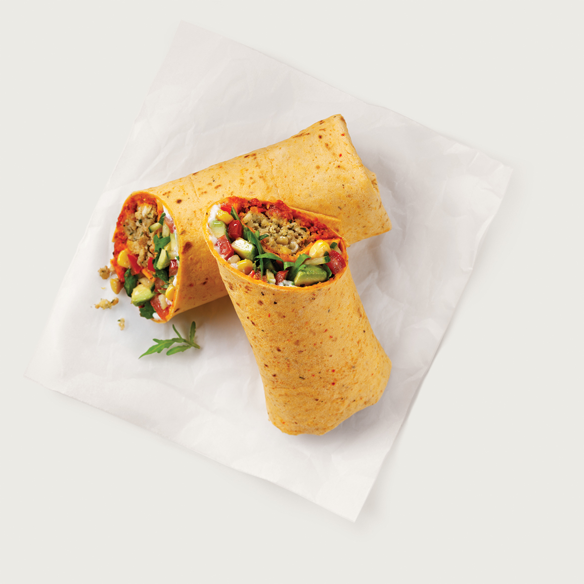 Der feine vegane Wrap ist gefüllt mit Falafel, Avocadoscheiben, gemischtem Mexikanischen Salat sowie Tomatenpesto und wird in einem Tomaten-Fladenbrot serviert.