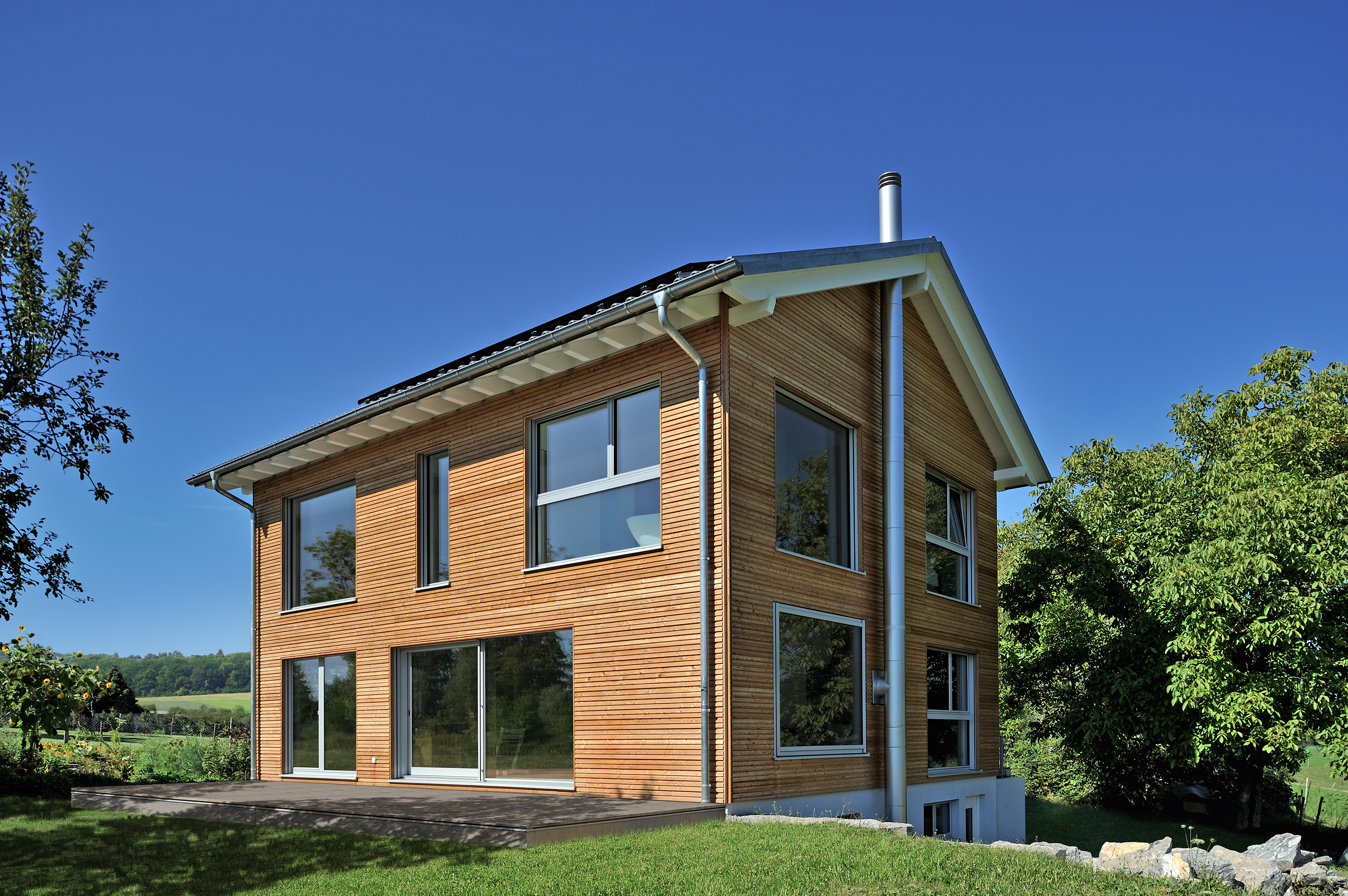 Das ideale Grundstück fand das Ehepaar in der Nähe von Bern. Soweit das Auge reicht, sieht es hier nur unberührte Natur. Diesen traumhaften Ausblick haben sich Sigrid und Jan-Willem Romijn buchstäblich ins Haus geholt. „Die großen Fenster, die die Landschaft wie Fotoaufnahmen umrahmen, bieten viel Licht und Aussicht“, schwärmt die Hausherrin. Die Landschaft schenkt dem zweigeschossigen Einfamilienhaus eine malerische Kulisse. Im Gegenzug fügt sich das Holzhaus harmonisch in die Umgebung ein. Die Verschalung „Rondo“ ist aus Lärche. Unbehandelt darf das Holz mit der Zeit natürlich vergrauen.
