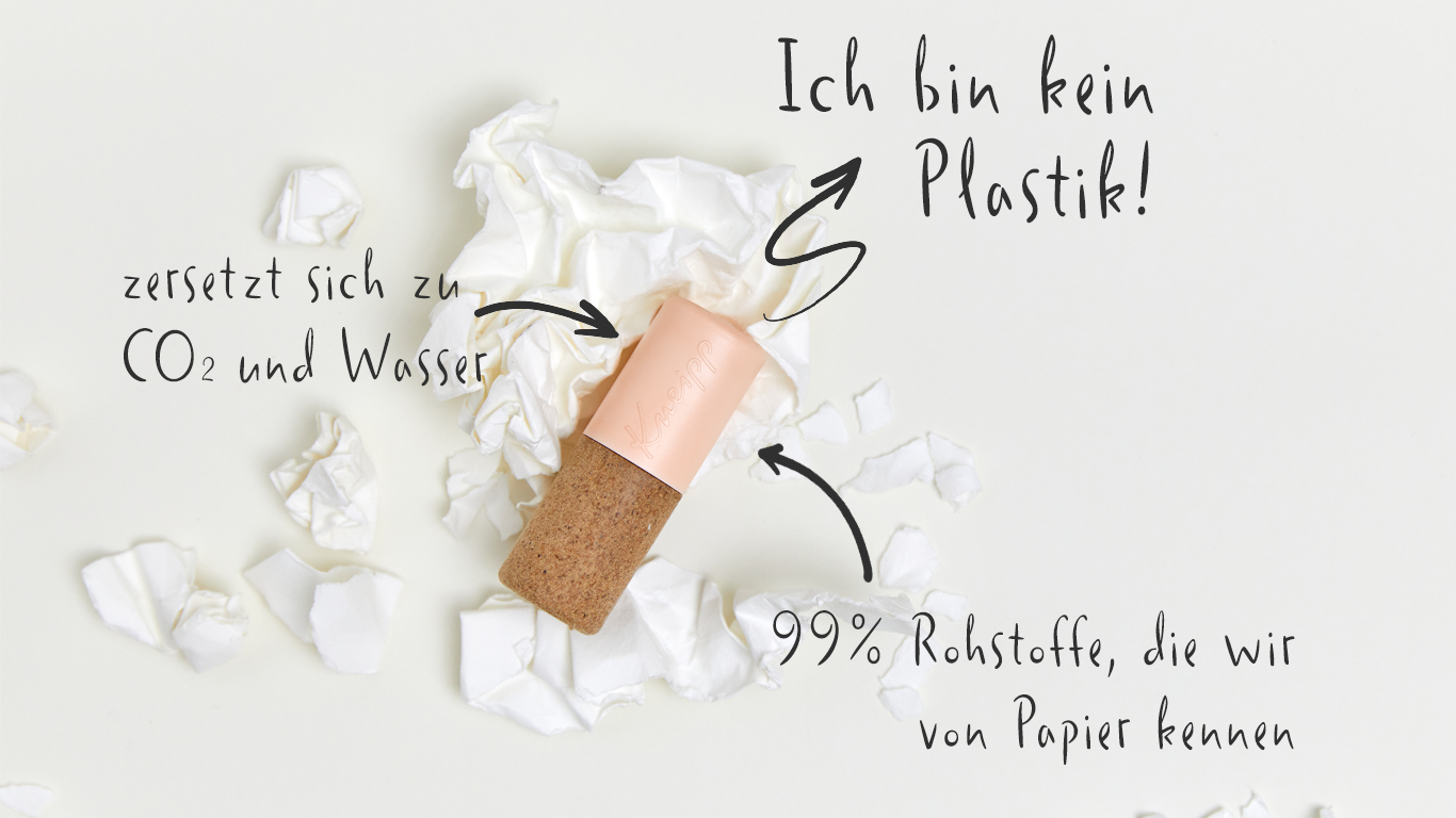 Mit dem Verpackungskonzept der Lippenpflege Samtweich hat sich die Marke auf unbekanntes Terrain gewagt: Die Kappe des Lippenbalsams besteht aus dem neuartigen Material Paper Blend, das Kneipp als erstes Unternehmen weltweit im Verpackungsbereich einsetzt. Paper Blend fühlt sich zwar an wie Plastik und sieht auch fast genauso aus, besteht aber aus biobasierten, nachwachsen- den Rohstoffen. Genauer gesagt, zu 99 Prozent aus Rohstoffen, die wir von ganz normalem Papier kennen. Gelangen die Paper-Blend- Verpackungen in die Umwelt, zersetzen sie sich zu Biomasse – am Ende bleiben nur CO2 und Wasser.