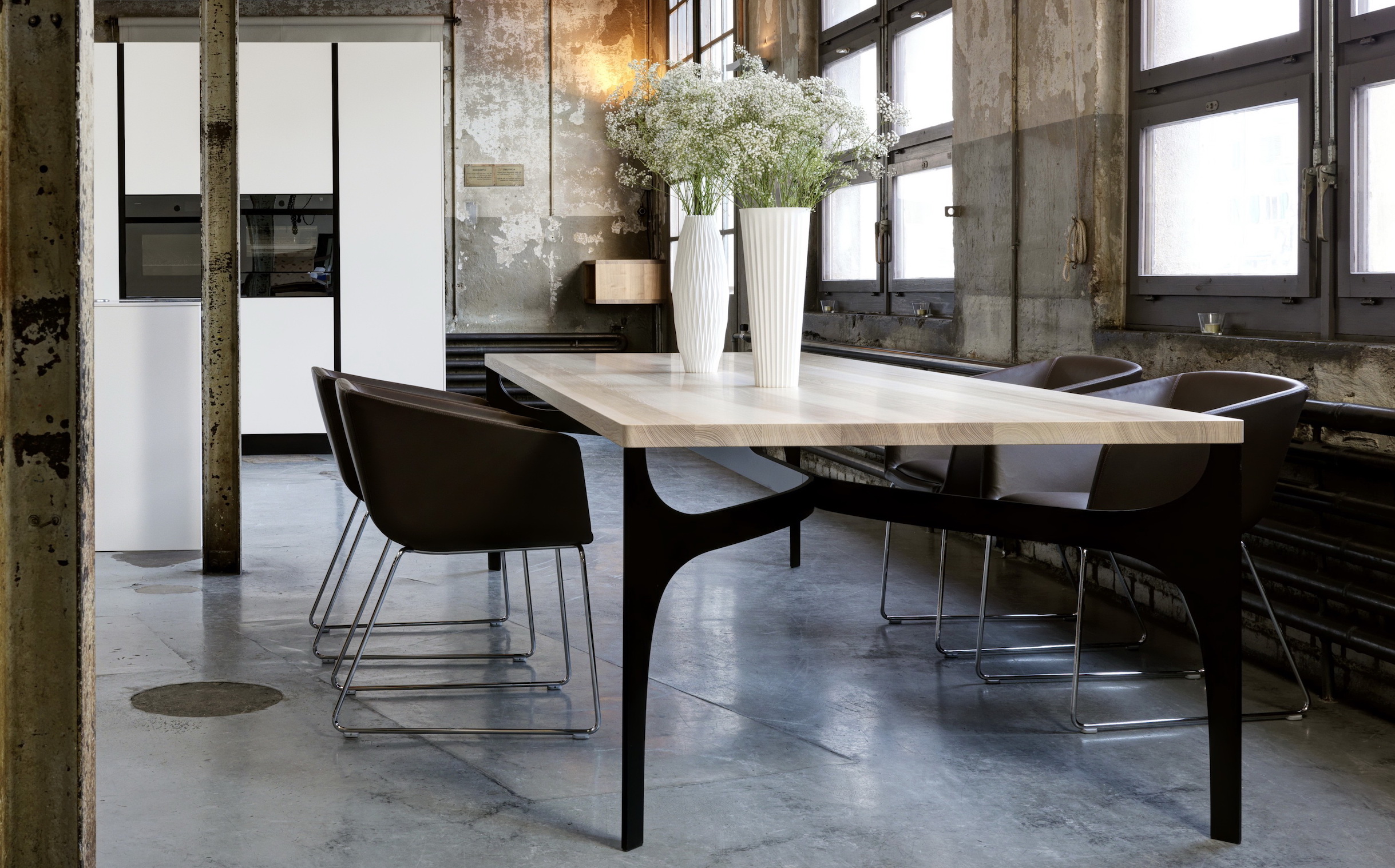 Edles Holz auf einem geschwungenen Stahlträger – der Tisch ‹OSCAR› von IGN beeindruckt mit seiner Spannweite. Das skulpturale Untergestell aus Stahlblech sorgt mit einer filigranen Dimensionierung und leichtem Schwung für eine fast schwebende Erscheinung der bis zu vier Meter langen Holztafel.