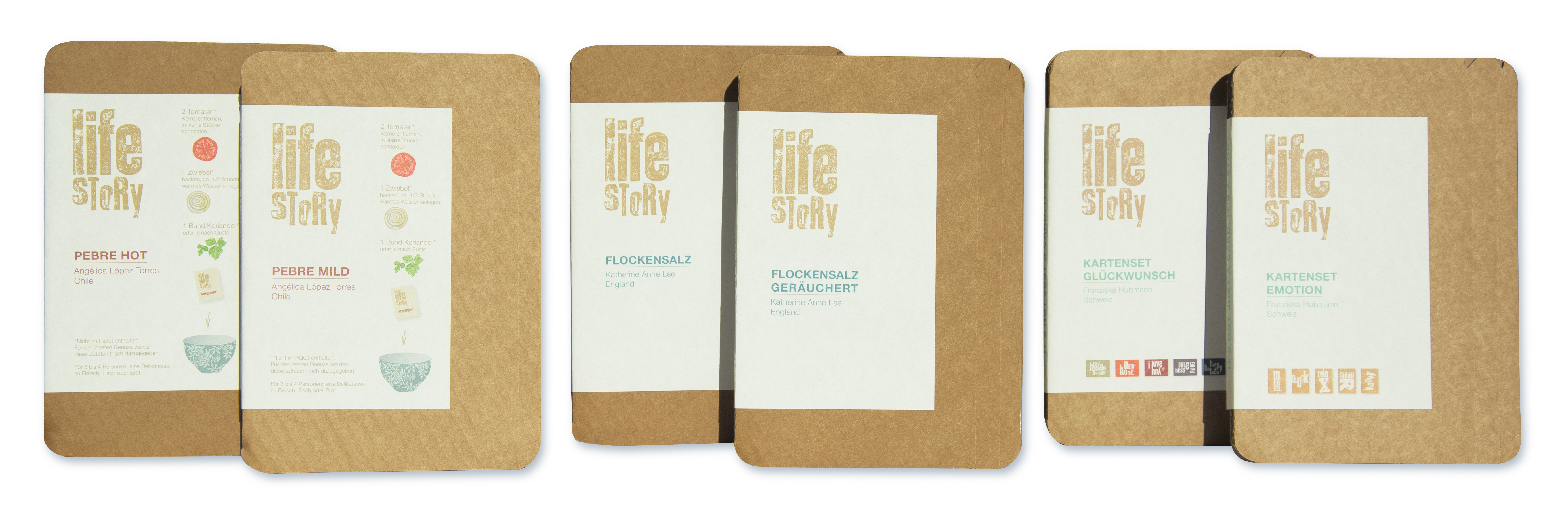 Angefangen hat alles mit einer rassigen, chilenischen Sauce namens Pebre und der eindrücklichen Lebensgeschichte von Angélica Lopez Torres aus Chile. Während die LifeStory Gründer die köstliche Sauce genossen, lauschten sie den Erzählungen von Angélica. Schnell war klar, dass ihre Geschichte weitererzählt werden muss. Bei den LifeStory Produkten steht die aussergewöhnliche Lebensgeschichte eines Menschen im Vordergrund und wird mit einem hochwertigen Produkt gepaart, das mit der Person und ihrer Geschichte in enger emotionaler Verbindung steht. Symbolisch wird eine Verpackung in Buchform verwendet und auf der Rückseite die Gesichte erzählt. Im Innern verbirgt sich das Produkt und eine Postkarte mit zusätzlichen Eindrücken zur Person. Neben der Sauce aus Chile enthält das Sortiment zur Zeit das Salz der britsch-schweizerischen Autorin Katherine Anne Lee und das farbenfrohe Kartenset von Franziska Hubmann und ihren Gutenberg Druckbuchstaben.