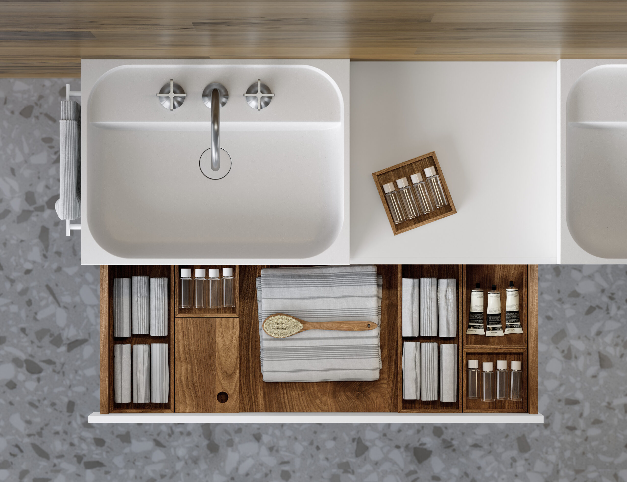 Elegant schafft «source» den passenden Platz für Handtücher oder Hygieneartikel. Alles ist aufgeräumt und jeder Gegenstand für das tägliche Ritual im Bad hat seinen Platz. Ob in den edlen Holzschubladen, auf den ergänzenden Ablagen oder im passenden Hochschrank.