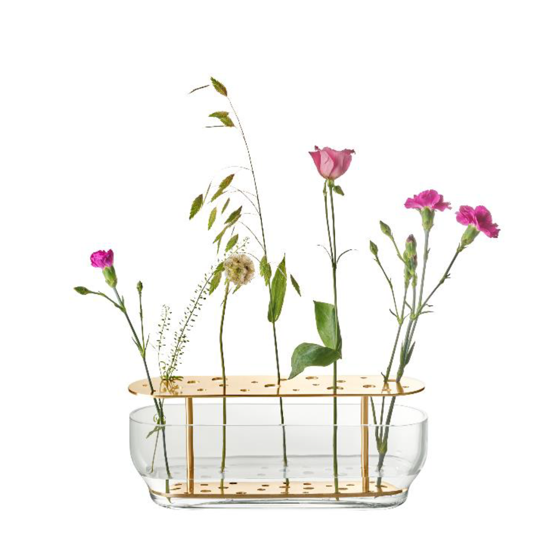 IKEBANA, LANG: für Blumenliebhaber und Design-Freunde Die attraktive neue Ikebana Vase ist eine sprichwörtliche Erweiterung der beliebten, von Jaime Hayon entworfenen Vase. Diese Version eignet sich nicht nur als Vase, sondern auch als Mittelpunkt eines Esstisches, wo sie die ganze Blumenpracht wunderbar in Szene setzt. Die lange Ikebana Vase wirkt auch eingerahmt von einem Fenster oder auf einem Regal, was sie zu einem idealen Accessoire sowohl für Blumenliebhaber als auch für Freunde von edlen Designs macht. Das Glas ist handgefertigt mit messingbeschichtetem Edelstahl.