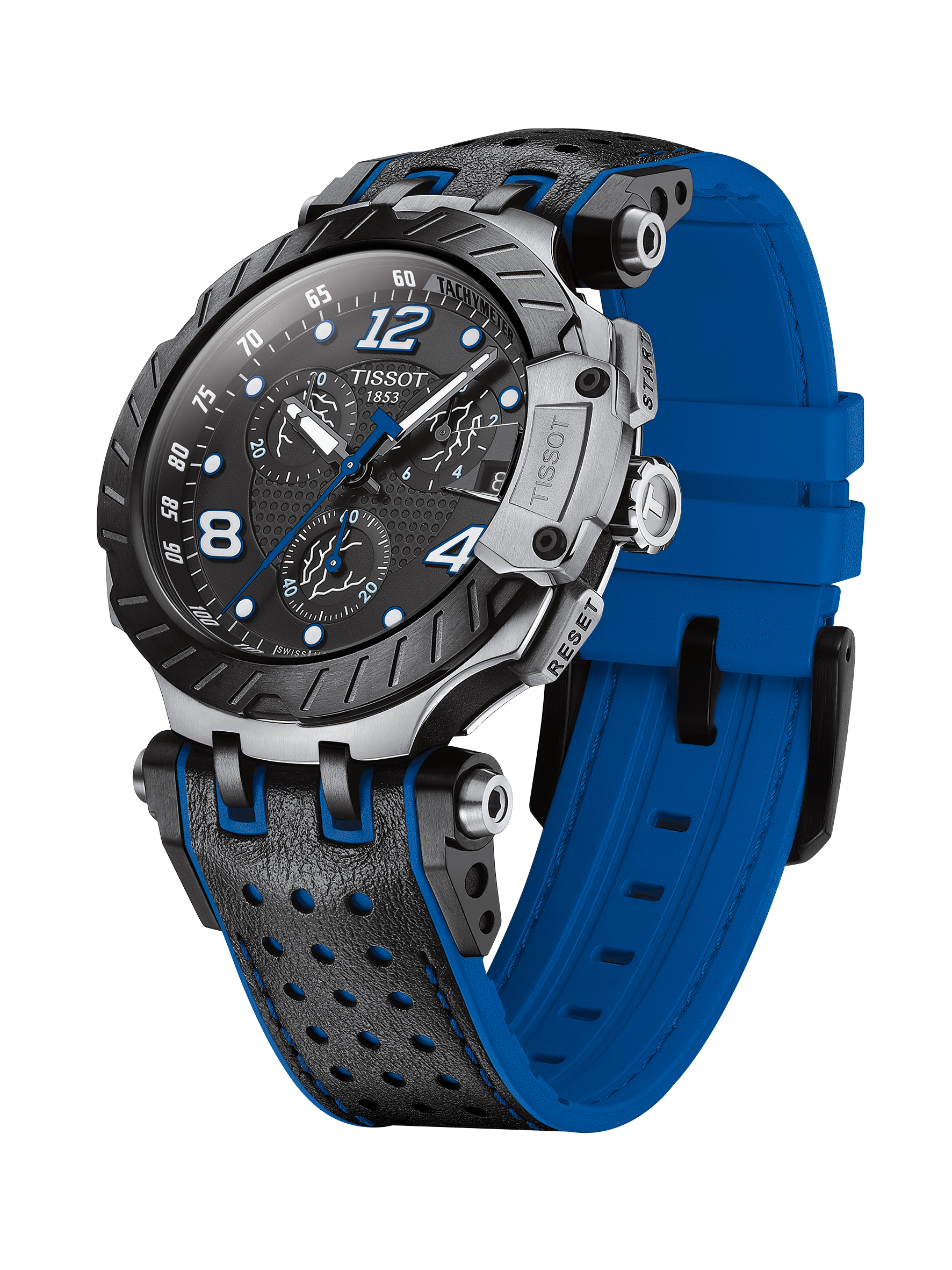 Die Uhr besticht mit massgeschneiderten Design-elementen wie dem Logo des Schweizer Fahrers, das auf den Zählern prangt und auf den Gehäuseboden graviert ist. Darüber hinaus zeigen sowohl die Uhr als auch das passende Lederarmband sich mit einem brillanten Blauton – ein symbolischer Verweis auf Lüthis erfolgreiche Karriere.