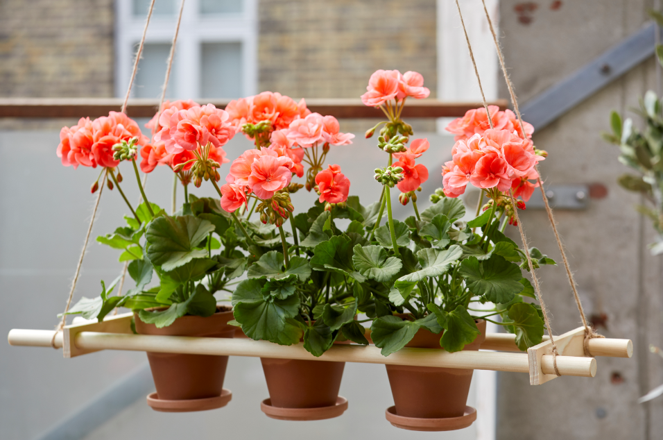 Diese einfach umzusetzende DIY-Aufhängung ist durch die vertikale Anordnung zweier Geranientöpfe besonders platzsparend.