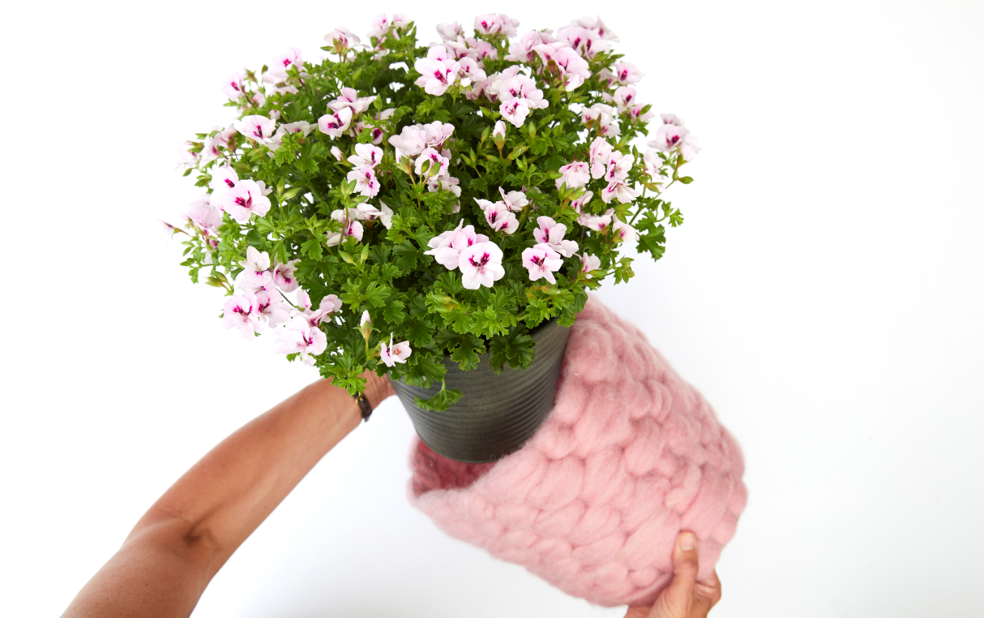 Und so wird’s gemacht: Zunächst das Drahtgewebe auf die erforderliche Höhe und Länge zurechtschneiden. Um die richtige Grösse abzuschätzen, legt man das Drahtgewebe am besten einmal locker um den Übertopf. Anschliessend die Wolle bahnenweise durch das Gitter fädeln. Unterschiedlich grosse Abstände lassen das Ergebnis lebendiger wirken. Wenn das gesamte Drahtgewebe mit Wolle bedeckt ist, müssen noch die beiden Gitterenden miteinander verbunden werden. Zum Schluss den Übertopf mit der Wollhülle einkleiden und die Geranie in den Topf stellen. Fertig! Tipp: Duftgeranien sind auch in der kreativen Küche eine geschätzte Zutat. Sie kommen in Fleischgerichten, Salaten und Tees ebenso zum Einsatz wie in Kuchen, Konfitüren oder Desserts. Duftgeranien mit Zitronenaroma sind darüber hinaus ein natürlicher Insektenschutz.