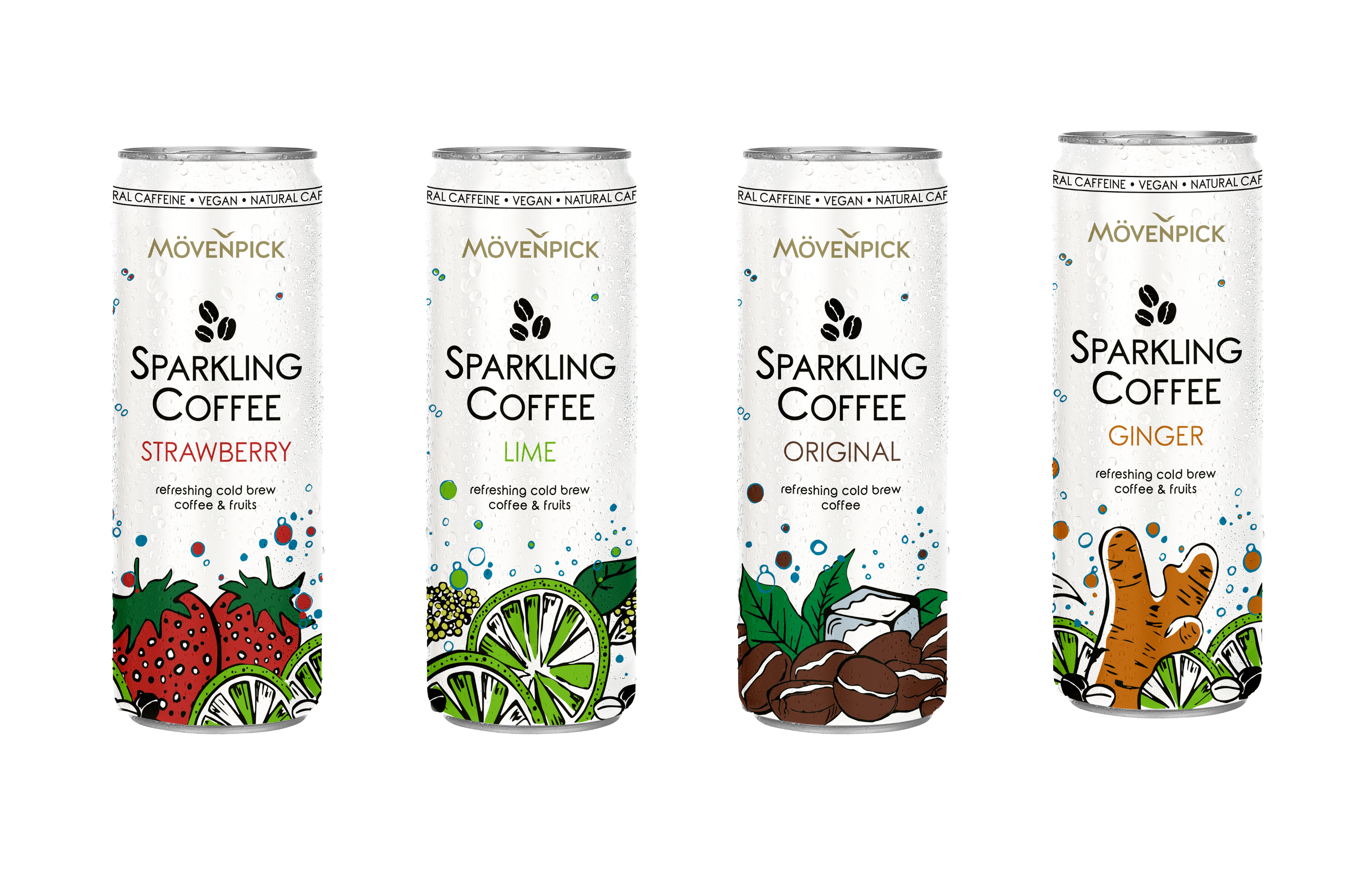 Sparkling Coffee von Mövenpick kombiniert kalt gebrühten Kaffee mit erfrischendem Fruchtgeschmack und prickelnder Kohlensäure. Ein ganz neues Trinkvergnügen und das ideale Sommergetränk! Eine ausgewählte Arabica-Robusta-Kaffeemischung wird mit natürlich frischem Bergquellwasser während 12 Stunden gebrüht. Daraus entsteht echter Cold Brew Coffee. Dieser milde Cold Brew Coffee wird anschliessend mit Kohlensäure versetzt und mit natürlichen Fruchtaromen veredelt. Sparkling Coffee sorgt mit 29 mg Koffein auf 100 ml für die nötige Energie und ist vegan.