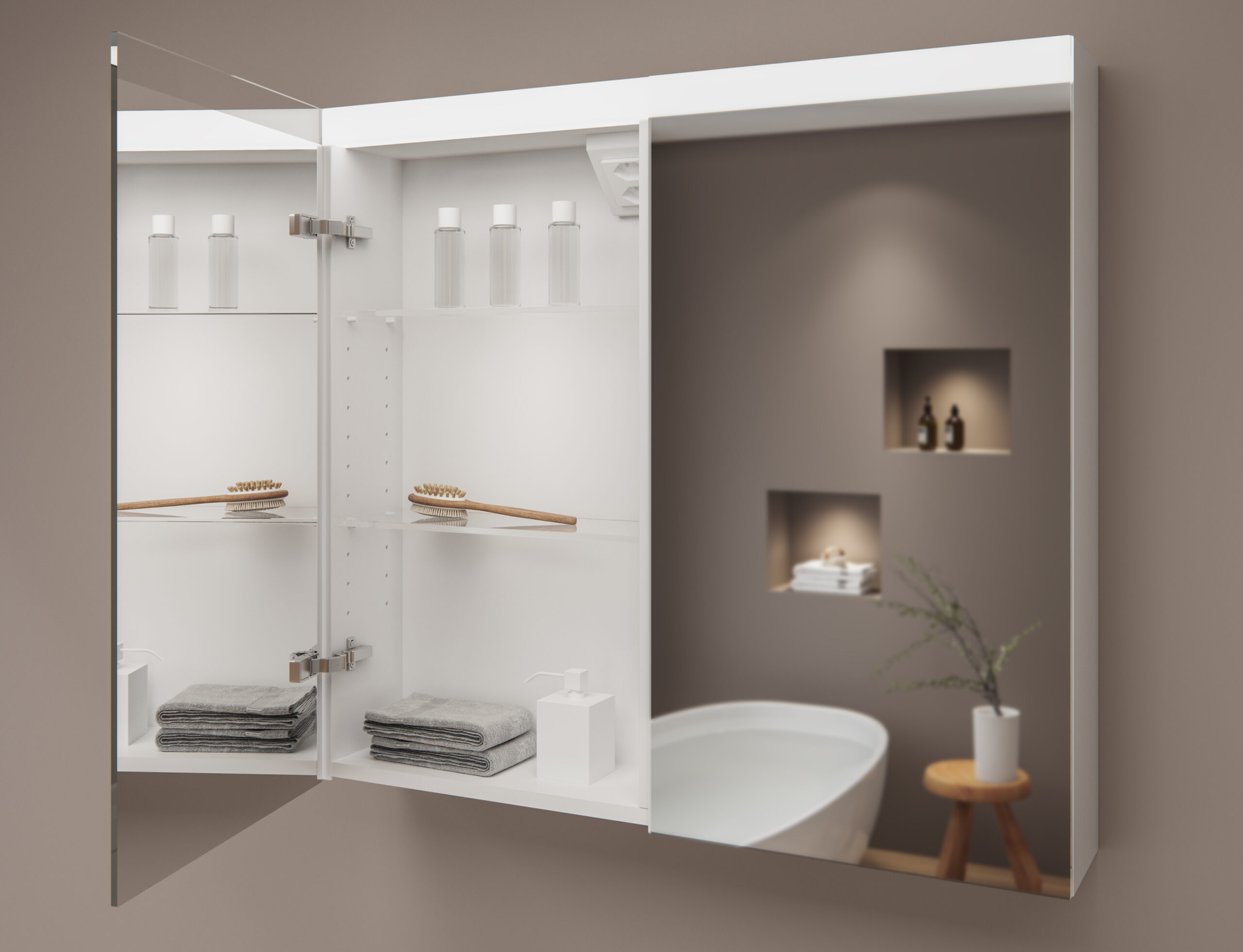 Wahlweise lässt sich der neue Spiegelschrank compact auf die Wand aufsetzen oder als Einbausystem intus® flächenbündig in die Wand einbauen. In beiden Fällen richten sich Form, Funktion und sein Licht vollständig nach den persönlichen Bedürfnissen. Zusätzlich ist der Spiegelschrank in Breite, Höhe und Tiefe variabel erhältlich. Bei der Wahl des Lichts stehen alle Optionen von Warmlicht bis Kaltlicht offen.