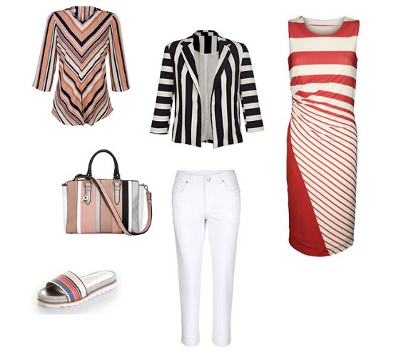 Im beliebten Maritim-Look, in der zeitlosen monochrom Kombination Schwarz-Weiss oder mehrfarbig und etwas auffälliger – Streifen verleihen dem Outfit dezent einen eleganten modischen Twist. Blazer und Tuniken in Streifenoptik passen ideal zu einer unifarbenen Hose, wie der weissen 7/8-Jeans, die in keiner Sommergarderobe fehlen darf. Experimentierfreudige Fashionistas wagen etwas mehr und kombinieren den eleganten Blazer von Amy Vermont mit einem weiteren Teil mit Streifendesign, wie dem gerafften Kleid von Amy Vermont, und kreieren dabei einen trendigen Look der sich sehen lassen kann. Der Streifzug zieht sich auch durch die Accessoires weiter. Mit der geräumigen Tasche von Picard und den modischen Pantoletten wird der Look unterstrichen.