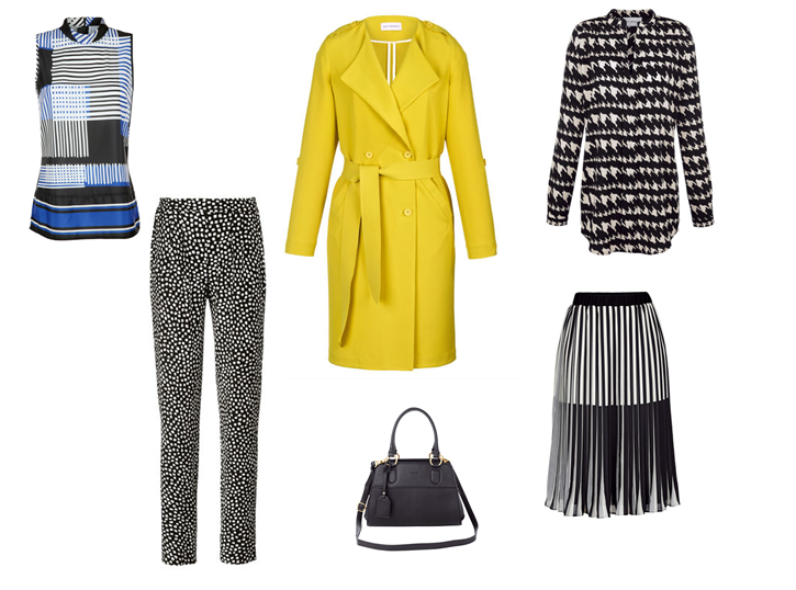 Streifen mit Punkten, Blumen- mit Karomustern oder Animal- mit Grafikprint – alles ist erlaubt und sogar erwünscht. Der Kreativität und Fantasie sind keine Grenzen gesetzt. Mode ist Kunst und der eigene Stil Ausdruck der Persönlichkeit und dieser darf gerne auch etwas wilder und buntgemischt ausfallen. Die bequeme Hose mit elegantem Druck lässt sich perfekt zu der modischen Bluse mit grafischem Design kombinieren. Dabei treffen verschiedene Grafikprints und Farben aufeinander und kreieren einen mutigen Look. Einen schicken Kontrast ergeben Streifen und das Hahnentritt-Design. Der komfortable Plisseerock von Amy Vermont bringt Schwung in den Alltag und lässt sich mit der eleganten Bluse perfekt kombinieren. Ein Mix & Match Outfit rundet man am besten mit schlichten Details ab, wie einem unifarbenen Mantel und einer eleganten Handtasche, die Ruhe in die kontrastreichen Outfitkombinationen bringen.