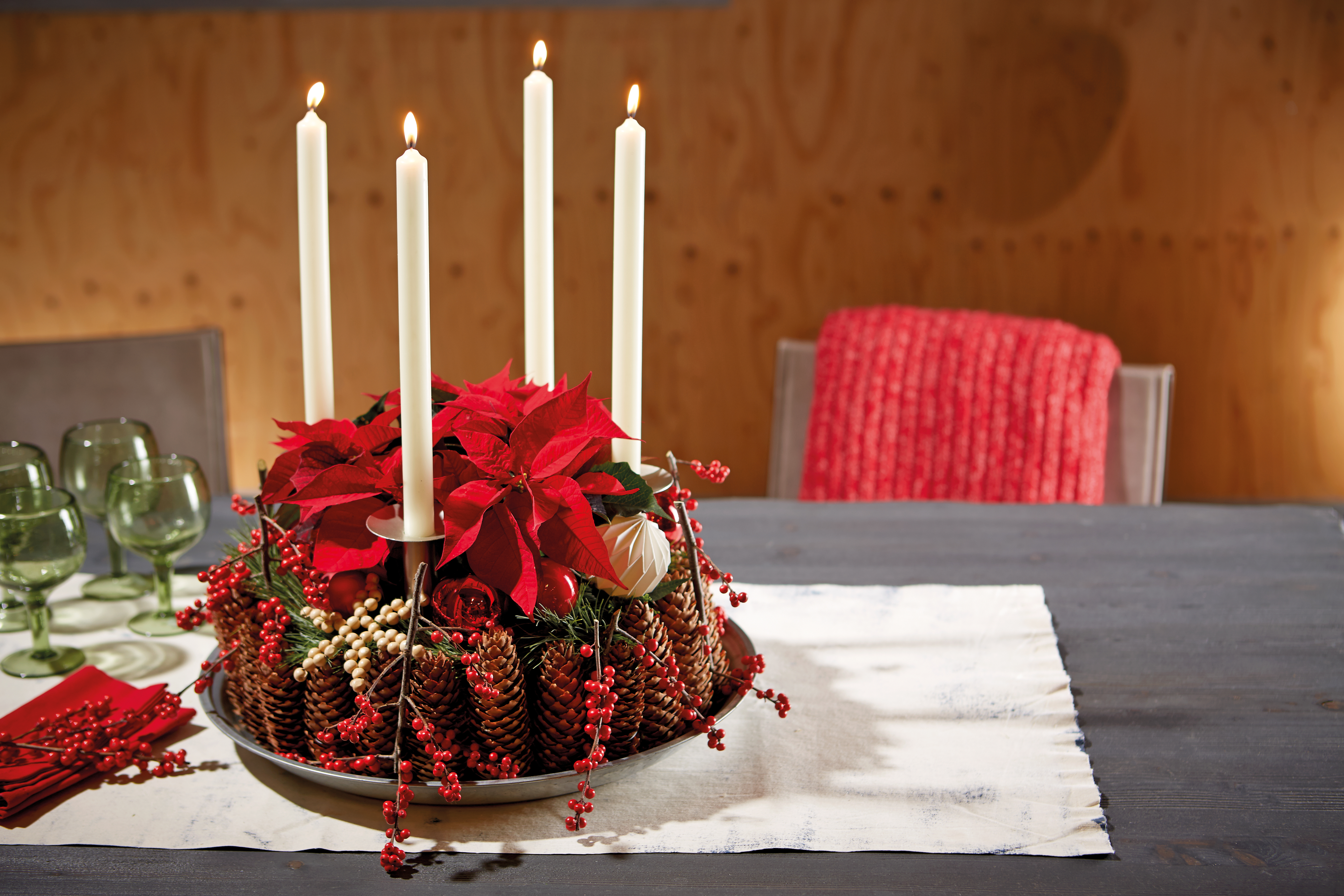 Ein schwebender Adventskranz ist eine platzsparende Alternative zum klassischen Adventskranz und schafft Raum für noch mehr Dekoration. Auch für Haushalte, in denen kleine Kinder leben, ist die hängende Variante perfekt, weil die kleinen Hände so nicht an die Kerzen gelangen können. Mit dem passenden stählernen Deckenkranz lässt sich die Dekoration im Handumdrehen selbst gestalten. Hierfür den Kranz abwechselnd mit roséfarbenen Mini-Poinsettien, Efeu und Mühlenbeckien bepflanzen und anschliessend lange, schlanke Kerzen in die vorgesehenen Halterungen stecken. Aufhängen. Fertig! Das Bepflanzen geht leichter von der Hand, wenn der Kranz währenddessen erhöht steht, etwa indem er auf einen grossen Topf aufgelegt wird. Tipp: Silberne Stabkerzen sind trendy und wirken gleichzeitig elegant.