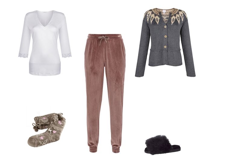 Was gibt es gemütlicheres, als an einem verschneiten, kalten Weihnachtsmorgen seinen Tee oder Kaffee in Ruhe vor dem Kamin zu geniessen. Dabei darf ein bequemes Outfit natürlich nicht fehlen. Die lockere Trainerhose bietet Wärme und Tragekomfort. Kuschelsocken und Finken sorgen für warme Füsse. Mit einem Shirt mit Spitzenbesatz sowie dem winterlich bestickten Jäckchen ist zudem der Oberkörper stilvoll vor Kälte geschützt. So ausgerüstet steht einem kuscheligen Wintertag nichts im Weg und Frau kann den Schnee in vollen Zügen geniessen.