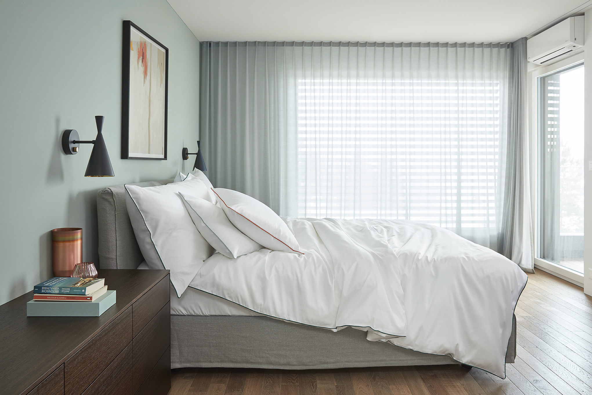 So besticht auch das Elternschlafzimmer durch eine stilsichere Einrichtung und Möblierung: Die eine Wand ist in einem dunklen Mint-Ton gestrichen und bietet für das Doppelbett einen gelungenen Hintergrund. Flankiert wird das Bett von zwei Wandleuchten über den Nachttischen. Über dem Betthaupt zieht ein Bild in dezenten Farben und poetischen Formen den Blick auf sich. Und natürlich stammt die Bettwäsche vom eigenen Bettwäschelabel „white+“. Wie überall im Haus bilden auch im Schlafzimmer raumhohe halbdichte sandfarbene Vorhänge aus Wolle einen temporären Sichtschutz.